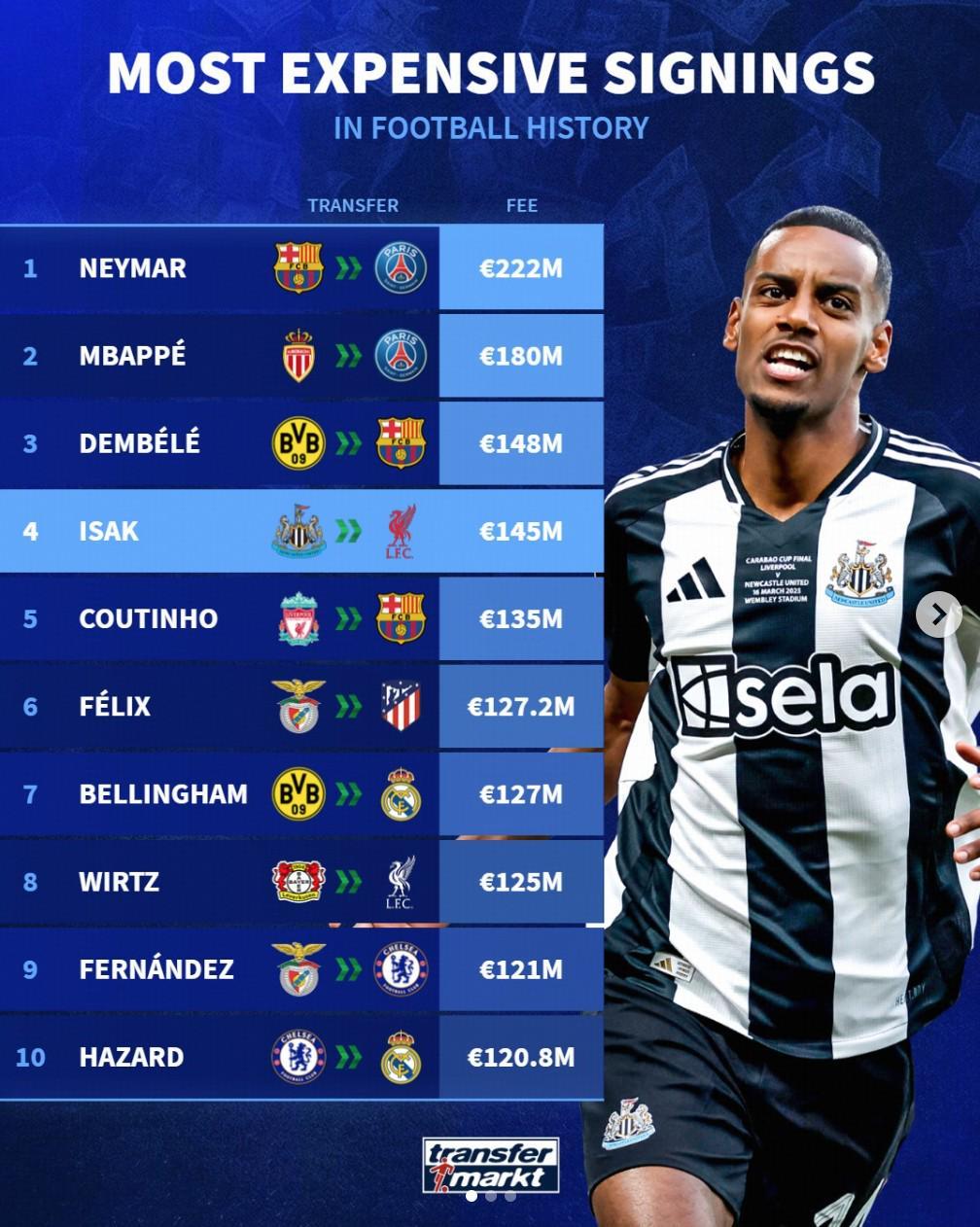 2025年夏窗结束,世界足坛历史转会费的TOP50榜更新,今夏五人上榜,伊萨克与维尔茨进入前十。内马尔的2.22亿欧依然居首,他也是唯一三度上榜的球员。